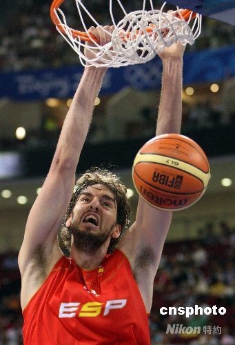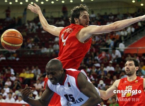北京奧運(yùn)會(huì)男籃小組賽最后一輪賽事8月18日在北京五棵松籃球館舉行,此前三勝一負(fù)的世錦賽冠軍西班牙隊(duì)以98比50擊敗非洲冠軍安哥拉;安哥拉隊(duì)五戰(zhàn)五負(fù),小組墊底。西班牙的超級(jí)巨星保羅·加索爾僅僅上場(chǎng)23分鐘,不僅砍下全場(chǎng)最高的31分,而且嚴(yán)密的防守讓對(duì)手往往無功而返,充分體現(xiàn)了“領(lǐng)袖氣質(zhì)”。中新社發(fā) 任晨鳴 攝