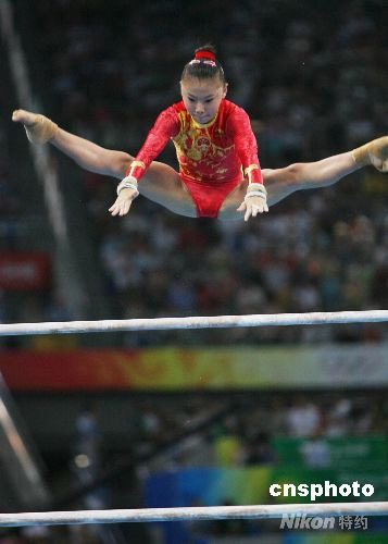 8月18日,中國選手何可欣在北京奧運(yùn)會(huì)女子高低杠決賽中表現(xiàn)出色,奪得金牌。 中新社發(fā) 武仲林 攝