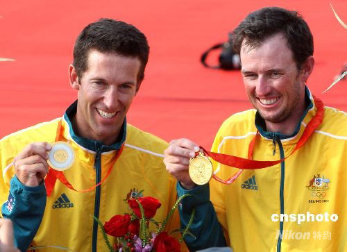 8月18日,北京2008奧運帆船比賽在青島分賽場舉行,澳大利亞隊內(nèi)森·威爾莫特和馬爾科姆·佩奇組合獲得雙人艇男子470級冠軍。 中新社發(fā) 趙振清 攝