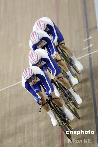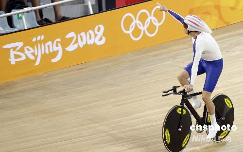 8月18日,北京奧運(yùn)會場地自行車男子4公里團(tuán)體追逐賽決賽在老山自行車館舉行,英國隊以3分53秒314的成績獲得金牌,打破世界紀(jì)錄。 中新社發(fā) 盛佳鵬 攝