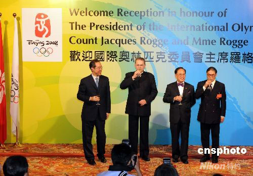 八月十八日,國(guó)際奧林匹克委員會(huì)主席羅格(左二)訪問(wèn)香港,出席行政長(zhǎng)官曾蔭權(quán)(左三)舉行的歡迎酒會(huì),與政務(wù)司司長(zhǎng)唐英年(左一)、香港奧委會(huì)主席霍震霆共同舉杯祝賀香港奧運(yùn)馬術(shù)比賽成功。 中新社發(fā) 蔡蔓莉 攝