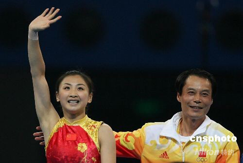 8月18日,中國(guó)選手何雯娜在北京奧運(yùn)會(huì)女子蹦床比賽中以37.80分奪得冠軍。 中新社發(fā) 武仲林 攝