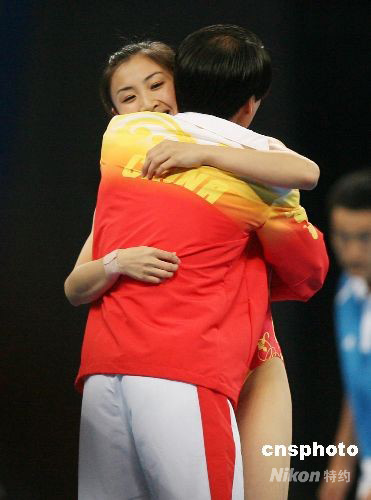 圖為何雯娜奪冠后與教練擁抱。中新社發(fā) 武仲林 攝