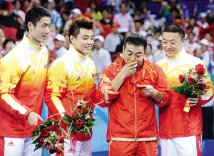 當三位隊員戴上沉甸甸的金牌,王勵勤向臺下的人指了指,王皓、馬琳也急忙揮手,不一會劉國梁終于走上了頒獎臺,只見王皓與馬琳一左一右摟著劉國梁,然后隊員們紛紛摘下自己的金牌套在他的脖子上,中國男團的眾志成城、團結一心叫人印象深刻,他們所做的一切為的就是完成國人對于國球不變的期望。