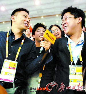 在水立方,霍啟剛接受了搜狐CEO張朝陽(yáng)的訪問(wèn)。(圖片來(lái)源:廣州日?qǐng)?bào))