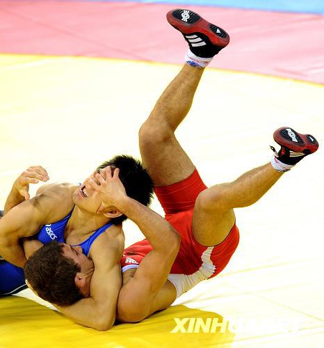 8月19日,在北京奧運(yùn)會(huì)摔跤男子自由式55公斤級(jí)半決賽中,日本選手松永共廣(藍(lán))戰(zhàn)勝俄羅斯選手別西克·庫杜霍夫,晉級(jí)決賽。新華社記者李鋼攝