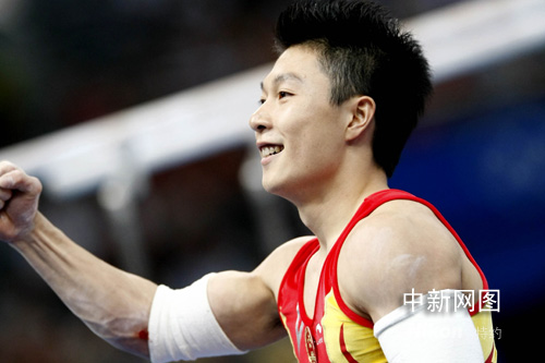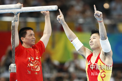 8月19日,中國選手李小鵬以總分16.450奪得北京奧運會體操男子雙杠金牌。中新社發(fā) 盛佳鵬 攝