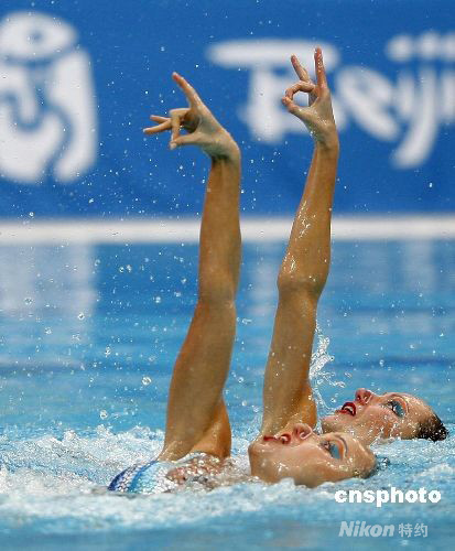 8月19日,2008北京奧運(yùn)會(huì)花樣游泳雙人自由自選預(yù)賽在國(guó)家游泳中心“水立方”進(jìn)行。衛(wèi)冕冠軍俄羅斯組合達(dá)維多娃/葉爾馬科娃以98.834的總分遙遙領(lǐng)先排名首位。 中新社發(fā) 杜洋 攝