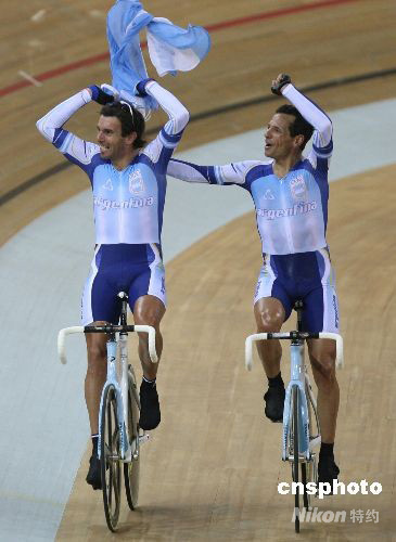 8月19日,阿根廷隊(duì)在北京奧運(yùn)會(huì)場(chǎng)地自行車麥迪遜賽上奪得金牌。 中新社發(fā) 武仲林 攝