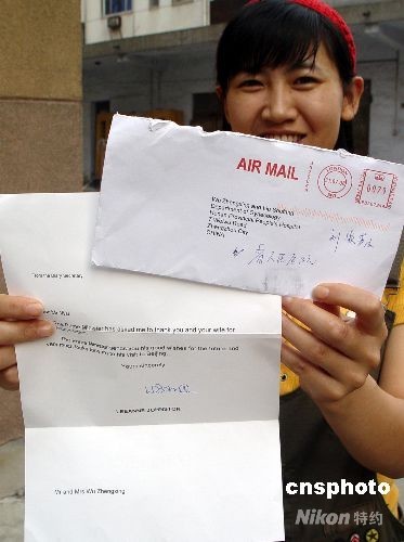 八月十九日,劉淑芳女士在展示英國首相布朗通過秘書發(fā)給其夫婦二人的信函。當日,一封發(fā)自英國倫敦唐寧街十號的信函飛到河南省會鄭州,落到中國第一對擔任過都靈冬奧會的“情侶火炬手”——吳振星、劉淑芳夫婦手中。英國首相布朗通過秘書表示說,自己對北京之行充滿期待。據(jù)了解,在七月初,這對夫妻曾通過信函的方式,分別給美國總統(tǒng)布什、英國首相布朗、法國總統(tǒng)薩科齊等寫信,誠邀三國元首參加北京奧運會,并到少林寺實地體驗中國功夫。 中新社發(fā) 李志全 攝