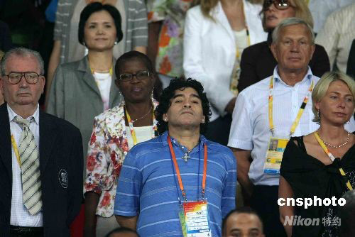 8月19日晚,北京奧運會男足第二場半決賽在北京工人體育場舉行,球王馬拉多納到場觀看巴西、阿根廷兩強遭遇戰(zhàn)。 中新社發(fā) 任晨鳴 攝