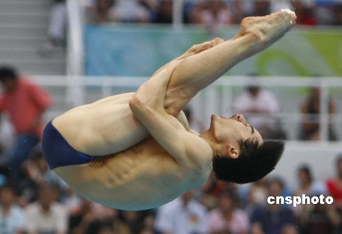 8月19日晚,北京奧運男子3米跳板決賽在國家游泳館“水立方”舉行,中國選手秦凱以572.90分獲得銅牌。他的隊友何沖以572.90分奪取金牌。 中新社發(fā) 杜洋 攝