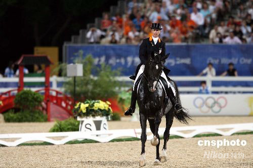 八月十九日晚,荷蘭選手安基·范格林斯芬駕坐騎“薩林雷羅”,在香港沙田奧運馬術盛裝舞步個人賽上,演繹“人馬合一”,技壓群雄,獲得該項目金牌。她是連續(xù)三屆奪得該項的奧運冠軍。 中新社發(fā) 洪少葵 攝