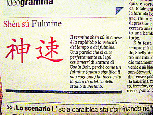 這個(gè)“漢字”專(zhuān)欄自北京奧運(yùn)會(huì)開(kāi)幕之日起,每天一期、每期一詞,每個(gè)詞都標(biāo)注拼音,引出一段新聞。如8月8日的專(zhuān)欄詞匯是“鳥(niǎo)巢”,在這兩個(gè)漢字下面用意大利語(yǔ)解釋了“鳥(niǎo)巢”在漢語(yǔ)中的本意,介紹了北京的國(guó)家體育場(chǎng),并配上焰火照耀下的“鳥(niǎo)巢”夜景圖片。其后的專(zhuān)欄相繼刊登了“文身”、“興奮劑”、“球門(mén)”、“地區(qū)”、“神速”等漢語(yǔ)詞匯。在漢字“興奮劑”下報(bào)道的新聞是:奧組委為實(shí)現(xiàn)“干凈的奧運(yùn)會(huì)”已向興奮劑宣戰(zhàn),北京設(shè)立了由220名高級(jí)專(zhuān)家組成的超級(jí)檢測(cè)中心,每天檢測(cè)數(shù)量達(dá)250例。“神速”一詞解讀的新聞是:這個(gè)在漢語(yǔ)中意為閃電般快速的詞,恰如其分地描繪了飛人博爾特17日晚破百米紀(jì)錄的情景。這名身高196cm的運(yùn)動(dòng)員,以其閃電般的速度征服了北京國(guó)家體育場(chǎng)內(nèi)的所有觀眾。(記者穆方順)
