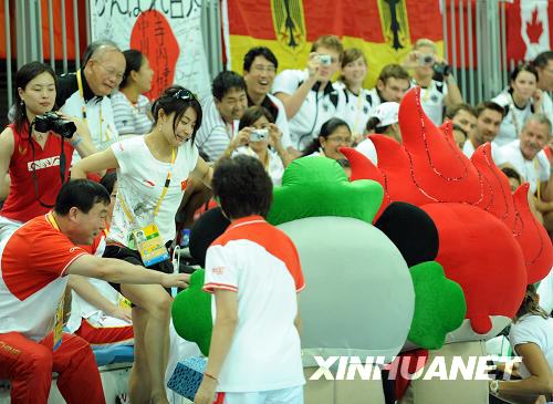 8月19日,中國(guó)選手郭晶晶在觀看比賽前和福娃合影。當(dāng)日,北京奧運(yùn)會(huì)跳水比賽在國(guó)家游泳中心——“水立方”繼續(xù)進(jìn)行,何沖在男子3米跳板決賽中獲得冠軍。 新華社記者趙鵬攝