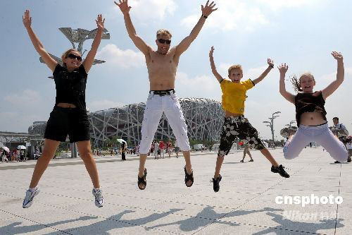 圖為外國游客一家人“鳥巢”外激情飛躍。