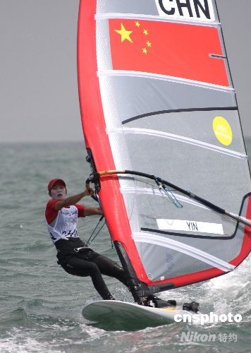 8月20日,北京2008奧運帆板比賽在青島分賽場舉行,在女子帆板RS-X級決賽里,中國選手殷劍獲得冠軍,為中國代表團奪得奧運會歷史上第一枚帆船項目的金牌。中新社發(fā) 趙振清 攝