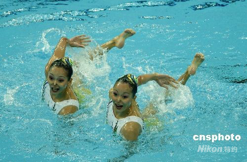 8月20日,在北京奧運(yùn)會(huì)花樣游泳雙人自由自選決賽中, 中國花樣游泳“姐妹花”蔣婷婷、蔣文文排名第四,無緣獎(jiǎng)牌。金牌被俄羅斯組合摘得。中新社發(fā) 杜洋 攝