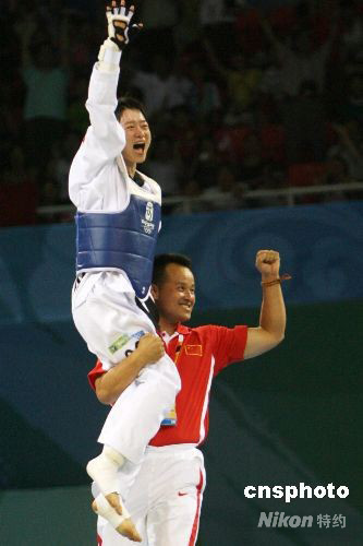 8月20日晚,21歲的中國姑娘吳靜鈺(左)在北京奧運(yùn)會跆拳道女子49公斤以下級冠亞軍決戰(zhàn)中,以1:-1戰(zhàn)勝泰國選手布特蕾·貝德蓬勇奪金牌,成為中國跆拳道在本屆奧運(yùn)會上奪得的第一枚金牌,中國體育代表團(tuán)金牌總數(shù)達(dá)到45枚。 中新社發(fā) 武仲林 攝