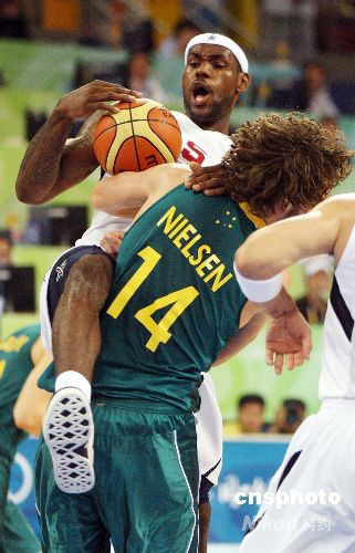 北京奧運(yùn)會(huì)男子籃球八進(jìn)四淘汰賽8月20日在五棵松籃球館開戰(zhàn),美國(guó)“夢(mèng)八隊(duì)”遭遇澳大利亞隊(duì)的頑強(qiáng)抵抗,最后以116比85擊敗澳大利亞隊(duì)進(jìn)入奧運(yùn)會(huì)男籃四強(qiáng)。中新社發(fā) 任晨鳴 攝