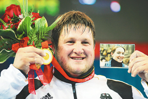 19日,男子舉重105公斤以上級(jí)的頒獎(jiǎng)儀式上演了感人一幕:該項(xiàng)目冠軍、德國(guó)選手馬·施泰納把亡妻蘇珊的照片和奧運(yùn)金牌高高舉起。這位德國(guó)大力士用一枚沉甸甸的奧運(yùn)金牌來(lái)祭奠亡故的妻子,此情此景,令人淚下。