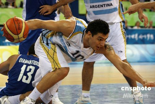 北京奧運(yùn)會(huì)男籃最后一場八進(jìn)四比賽,8月20日午夜時(shí)分在五棵松籃球館舉行,南美洲冠軍、雅典奧運(yùn)會(huì)冠軍阿根廷隊(duì)以80比78驚險(xiǎn)戰(zhàn)勝歐洲勁旅希臘隊(duì),進(jìn)入前四名。阿根廷隊(duì)將與美國“夢八隊(duì)”爭奪決賽權(quán)。隊(duì)中“老大”、在NBA馬刺隊(duì)效力的球星吉諾比利不僅砍下全場最高的24分,而且在最后時(shí)刻投中關(guān)鍵一球;另一名球星10號(hào)德爾菲諾(DELFINO Carios Francisco)砍下23分。中新社發(fā) 任晨鳴 攝