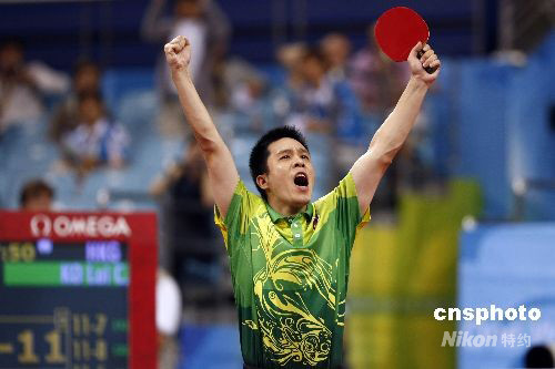 8月21日,北京奧運(yùn)會(huì)乒乓球男子單打第三輪的比賽在北京大學(xué)體育館進(jìn)行,中國香港選手高禮澤4比2戰(zhàn)勝韓國名將柳承敏晉級(jí)下一輪比賽。中新社發(fā) 盛佳鵬 攝