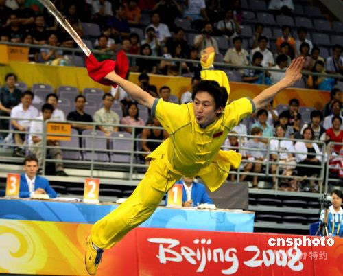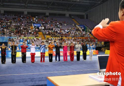 8月21日,“北京2008武術(shù)比賽”在北京奧林匹克體育中心體育館拉開帷幕!氨本2008武術(shù)比賽”經(jīng)國際奧委會批準,由北京奧組委、國際武術(shù)聯(lián)合會主辦,中國武術(shù)協(xié)會承辦,于8月21日至24日在北京舉行。比賽設(shè)套路10枚金牌、散手5枚金牌。有來自世界五大洲43個國家和地區(qū)的128名男女運動員參加比賽。為了使更多國家和地區(qū)的運動員在本次比賽中獲得獎牌,國際武術(shù)聯(lián)合會做出了在15個比賽項目中,每個國家和地區(qū)最多只能參加8項的規(guī)定。中新社發(fā) 宋吉河 攝