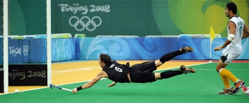 8月21日,在北京奧運(yùn)會男子曲棍球賽場上,新西蘭隊(duì)迎戰(zhàn)巴基斯坦,最終新西蘭隊(duì)以4:2獲勝。圖為新西蘭一名隊(duì)員飛身擊球。