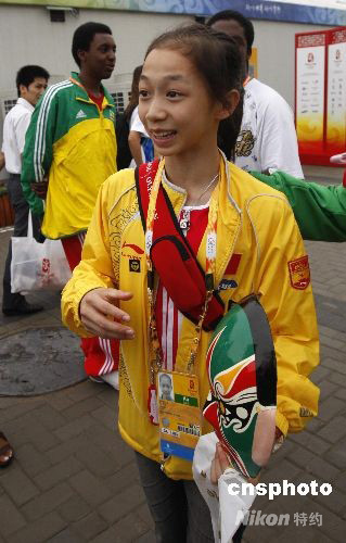 8月21日,北京奧運(yùn)會(huì)體操冠軍、中國(guó)選手楊伊琳,在北京奧運(yùn)村一邊逛街一邊尋覓自己喜歡的紀(jì)念章進(jìn)行交換。 中新社發(fā) 杜洋 攝