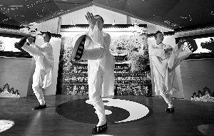 7月26日,“中國(guó)故事”湖北小屋內(nèi),正在進(jìn)行武當(dāng)功夫表演。陳杰 攝