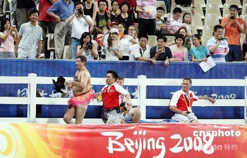 八月二十一日晚,在香港舉行的奧運馬術項目比賽進行最后一天賽事,場內(nèi)一觀眾著奇裝跑入賽場,被保安驅(qū)趕出場。中新社發(fā) 洪少葵 攝