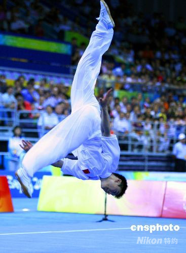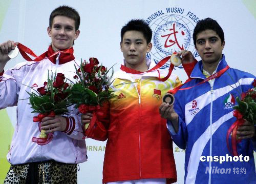 8月22日上午,中國運(yùn)動員袁曉超在北京2008武術(shù)比賽男子長拳賽中奪得金牌,俄羅斯、伊朗選手分別獲得銀牌和銅牌。中新社發(fā) 宋吉河 攝