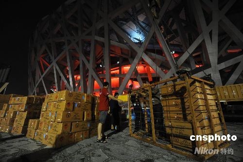 北京奧運(yùn)會(huì)閉幕式上的焰火表演將再次為世人奉獻(xiàn)一場華美的視覺盛宴。截止到八月二十二日下午,“鳥巢”煙花燃放已準(zhǔn)備就緒,屆時(shí)將為世人展現(xiàn)有別于開幕式的令風(fēng)姿。圖為負(fù)責(zé)煙火燃放的人員在鳥巢頂上安裝焰火。中新社發(fā) 鐘新 攝