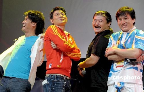 8月22日下午,明星成龍、劉歡、劉德華、周華健亮相北京奧林匹克公園,共同演唱一首《難說(shuō)再見(jiàn)》。這首動(dòng)人的歌曲將成為北京奧運(yùn)跟世界話別的標(biāo)志性符號(hào)。中新社發(fā) 陳文 攝