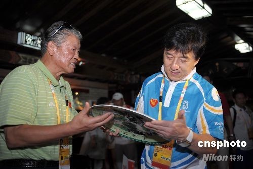 8月22日下午,曾任中共中央政治局委員、國務(wù)委員、全國人大常委會副委員長的李鐵映,與巨星成龍?jiān)诒本⿰W林匹克公園祥云小屋共同欣賞名貴瓷器。中新社發(fā) 陳文 攝