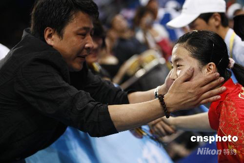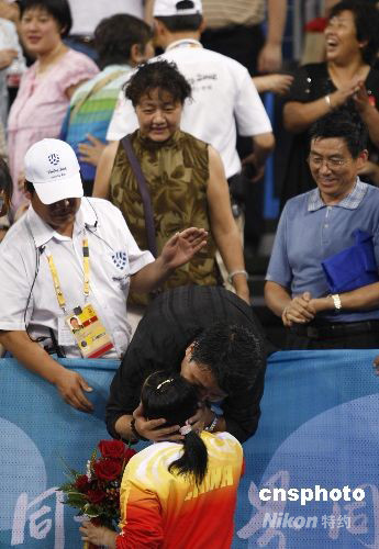 8月22日晚,在北京大學(xué)體育館進(jìn)行的北京奧運(yùn)會(huì)乒乓球女子單打決賽,中國(guó)乒乓球老將王楠抱憾負(fù)于隊(duì)友張怡寧獲得銀牌,在現(xiàn)場(chǎng)觀戰(zhàn)的王楠老公郭斌賽后撫慰愛(ài)妻。 中新社發(fā) 盛佳鵬 攝