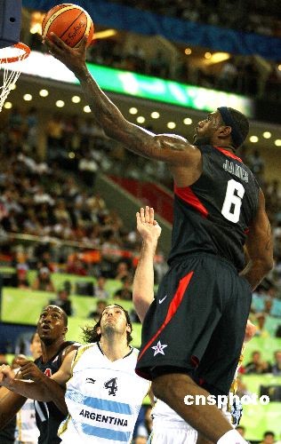 8月22日晚,北京奧運(yùn)會(huì)男子籃球半決賽第二場(chǎng)比賽在五棵松籃球館開戰(zhàn),志在奪冠的美國“夢(mèng)八隊(duì)”遭遇雅典奧運(yùn)會(huì)冠軍阿根廷隊(duì),最后以101比81獲勝,進(jìn)入決賽!皦(mèng)八隊(duì)”將與西班牙隊(duì)爭(zhēng)奪本屆奧運(yùn)會(huì)的男籃金牌。中新社發(fā) 任晨鳴 攝