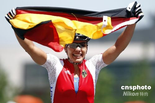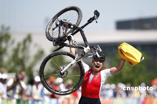 8月23日,北京奧運會自行車山地分項女子越野賽在北京老山山地自行車場舉行。德國選手扎比內·施皮茨一路保持領先,最終以1小時45分11秒的成績順利摘金。中新社發(fā) 盛佳鵬 攝