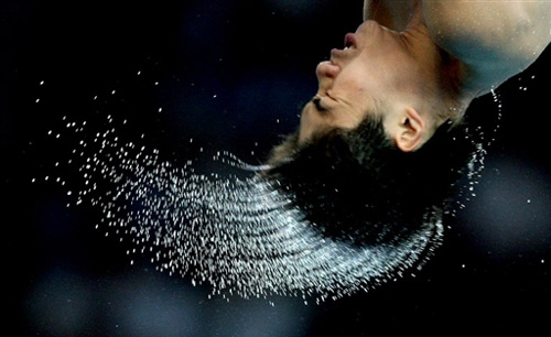 8月23日,中國選手火亮在北京奧運會男子10米跳臺比賽中,做空中旋轉(zhuǎn)時甩出了美麗的水花。