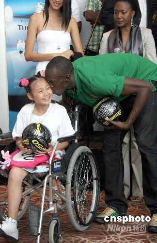 8月23日,北京奧運會田徑一百米、二百米比賽金牌獲得者牙買加運動員尤塞恩·博爾特親吻來自汶川映秀鎮(zhèn)因大地震受傷的小女孩黃思雨,并向她贈送一個簽名足球。當天,博爾特在北京向中國紅十字基金會捐贈善款五萬美元,以支持中國紅十字人道救助事業(yè)。中新社發(fā) 孫自法 攝