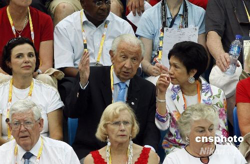 8月23日,國際奧委會終身名譽(yù)主席薩馬蘭奇,來到北京“水立方”觀看奧運(yùn)會花樣游泳集體項(xiàng)目決賽。 中新社發(fā) 杜洋 攝