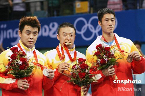 8月23日晚,中國選手馬琳、王皓、王勵勤包攬北京奧運會乒乓球男子單打金銀銅牌。 中新社發(fā) 武仲林 攝