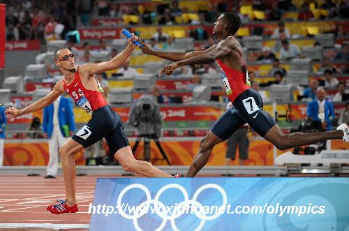 8月23日,美國隊選手杰里米·韋林納(左)從隊友戴維·內(nèi)維爾手中接棒。當日,美國隊在北京奧運會男子4X400米決賽中以2分55秒39的成績奪得金牌并打破奧運會紀錄。新華社記者 李尕 攝