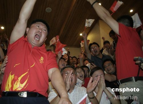 圖為觀看電視直播的周家人為周呂鑫喝彩。 中新社發(fā) 張婭子 攝