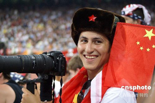 8月23日晚,在國(guó)家體育場(chǎng)“鳥(niǎo)巢”的觀眾席上,一位伊朗小伙子頭戴“雷鋒”帽,一邊拍照片,一邊狂熱地為比賽選手助威。當(dāng)現(xiàn)場(chǎng)有觀眾問(wèn)他姓名時(shí),他微笑著用中文回答“雷鋒”。中新社發(fā) 馬小剛 攝