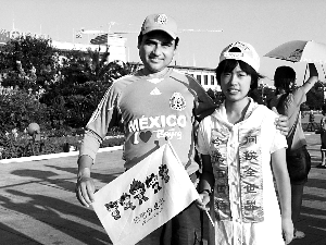 廣場上有位衣服上印有“Mexico”的男士,周由希開口就用西班牙語與他打招呼。這位墨西哥游客驚喜不已,興奮地介紹起自己的中國行。末了,還拿出相機與她合影。