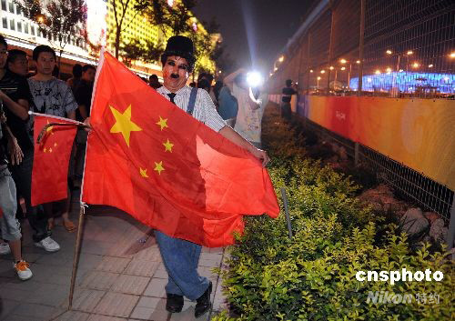 北京奧運會進(jìn)入尾聲,奧林匹克公園外人流不減,一位市民扮演喜劇明星“卓別林”。中新社發(fā) 廖攀 攝