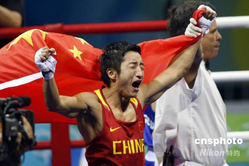 8月24日,在男子拳擊輕蠅量級(jí)(48公斤級(jí))比賽中,因蒙古選手普列布道爾吉·塞爾丹巴在第二局棄權(quán),中國拳王鄒市明奪得金牌。這是中國參加奧運(yùn)會(huì)以來獲得的第一枚拳擊金牌。