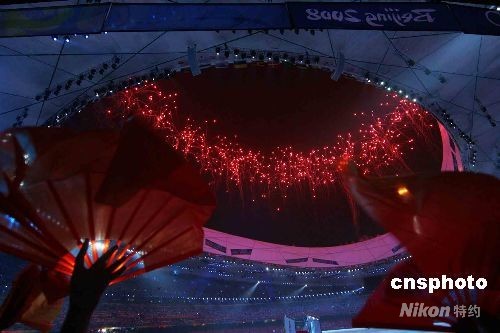 8月24日晚,第二十九屆夏季奧林匹克運動會在北京閉幕。盛大閉幕式開始,鳥巢焰火齊放,焰火圖案數字從29開始倒計時,最后一個數字“0”用拉手花束炸開一個滾動的、火紅的圓圈,圓圈周長長達600米,相當于圍繞鳥巢碗口“跑”一圈。中新社發(fā) 武仲林 攝